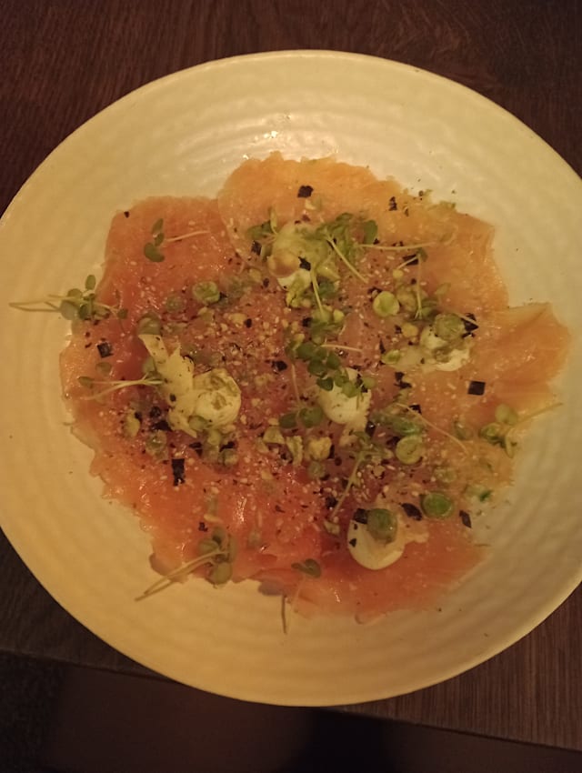 Carpaccio van de chef met spekjes, pijnboompitten en oude kaas
