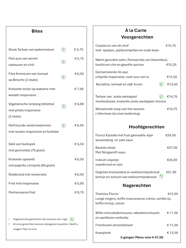 Lekker eten in Zwijndrecht doe je bij restaurant Florizz. Dit eetcafé heeft een uitgebreide menukaart met hoofdgerechten als ossenhaas, spareribs en varkenshaassaté. Je bent verzekerd van een heerlijke maaltijd, ook voor de kleintjes is er genoeg keus. Alle gerechten worden uitsluitend bereid met ve...