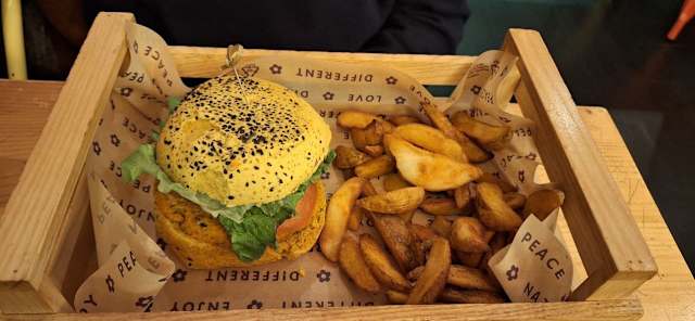 - Flower Burgher: pane nero, burgher di fagioli e seytan, salsa magik, flower cheddar, pomodori confit, insalata e germogli di soya