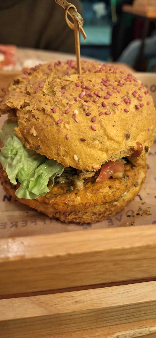 - Burger di ceci*, insalata, pomodori, avo hummus, flower mayo