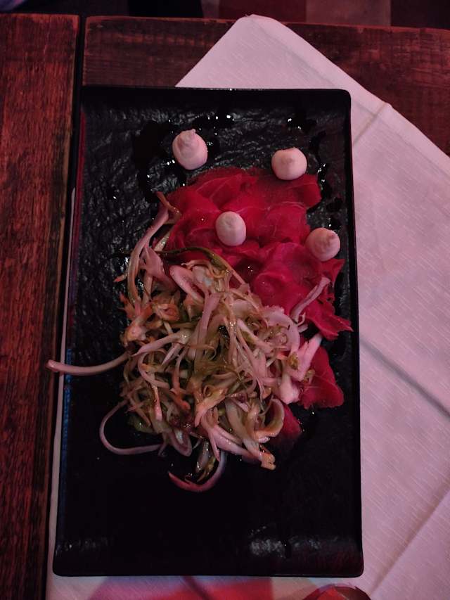 - Tartare di fassona, capperi, scalogno, acciuga, senape, worcestershire sauce, prezzemolo, tabasco, cognac e tuorlo d' uovo