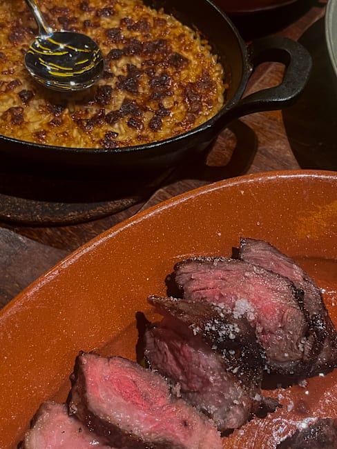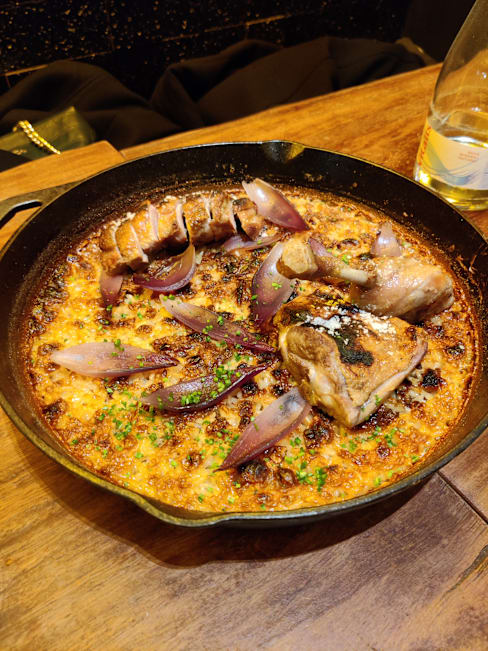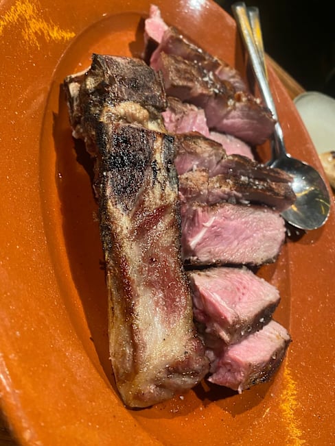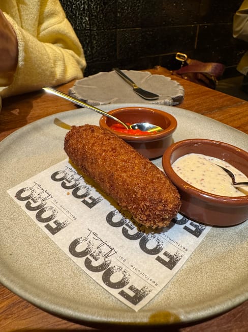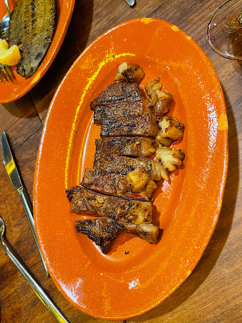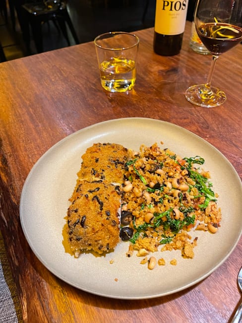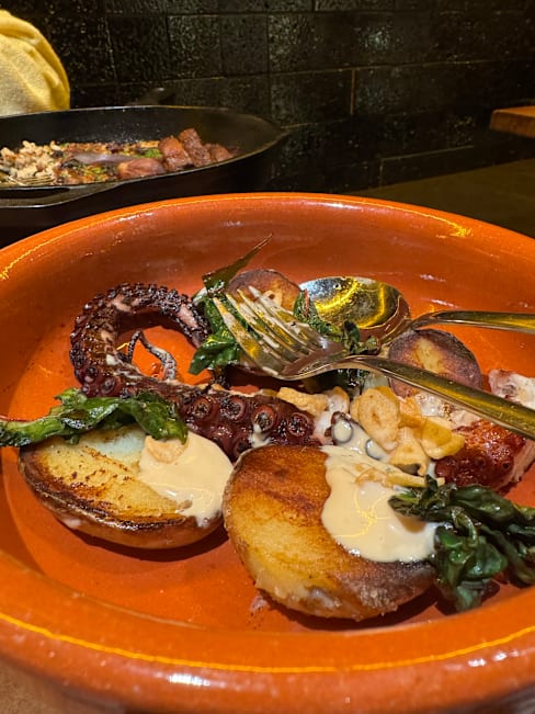 8.5/10+1Alexandre Silva's Fogo is a restaurant where everything is cooked with fire in the traditional way. We started with the couvert, which consisted of bread with olive oil, smoked butter, peppers and pickles. Everything was good. This was followed by the Alentejo pork cutlet with oven rice and the octopus à lagareiro. The meat was spot on, but the rice was disappointing. It lacked flavor and needed more time in the oven. The octopus was tender and the accompanying potatoes were delicious. It was a good meal without being excellent, mainly due to the slowness of the kitchen.
