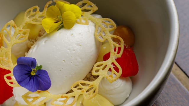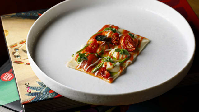Raviolo "caprese", almond ricotta, Piennolo tomato and basil oil