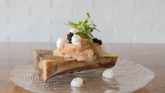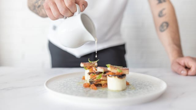 Criada en el pirineo aragonés y marinada en casa, sus huevas, crema agria, mermelada de cebolla caramelizada al vino tinto y vinagre de módena.