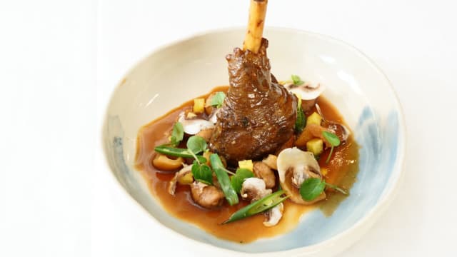 Estofado con vino tinto del matarraña, napados con una salsa de ceps y lascas de champiñón.