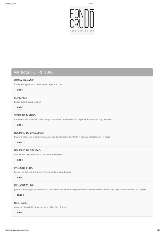 MENU 4 No Pesce No Sushi PER 2 PERSONE €50 per guest