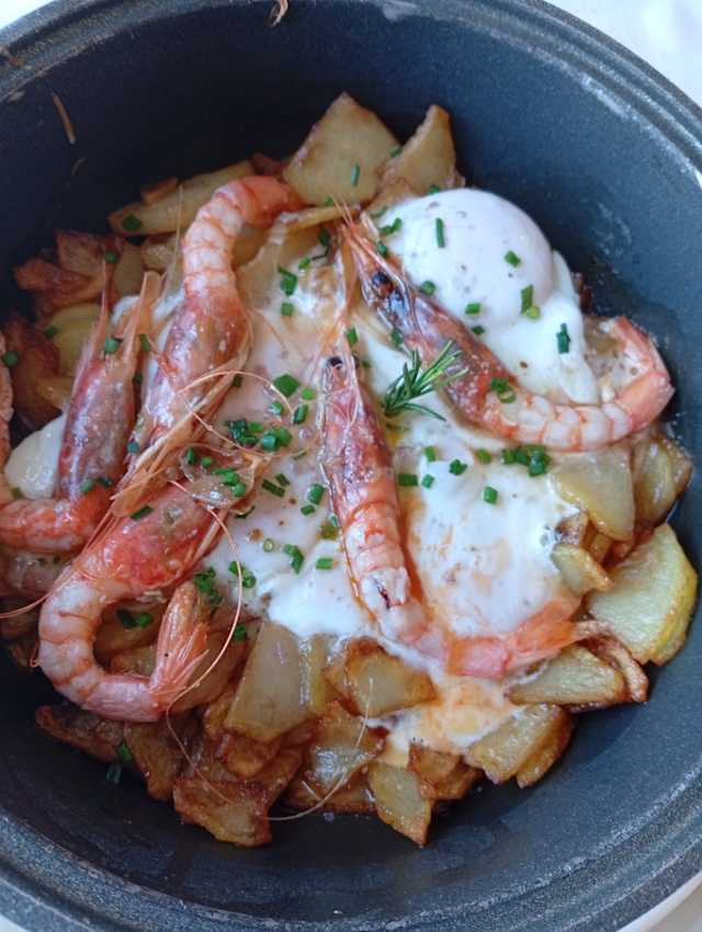 - 1a vida: gambes vermelles a l’allet i guindilla | 2a vida: ous ferrats de les nostres gallines sobre patates i el seu suc