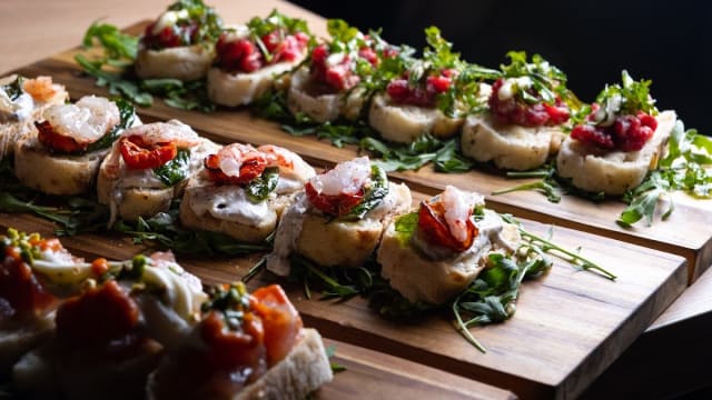 Drink ( calice di vino/birra alla spina/cocktail) - 4 pz di pinsa sushi - 2 pienozeppo - 2 pz zeppole con salsa - tagliere di focaccia - tagliere pinsa - chips