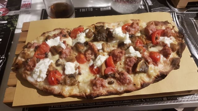 Pomodoro san marzano , fior di latte, salsiccia, tartufo in polvere, funghi champignon, stracciatella olio e.v.o. a crudo