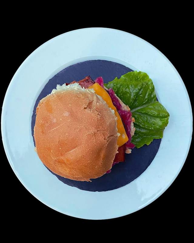 Hambunger di manzo sakura 180 gr., bun all'olio, cheddar, bacon, insalata e salsa foodoo e contorno a scelta