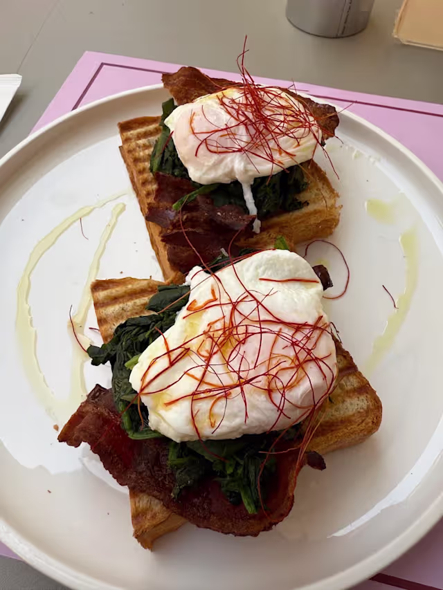 - Uova in camicia con pan brioche croccante, spinaci*, speck croccante, peperoncino, pepe nero, salsa olandese