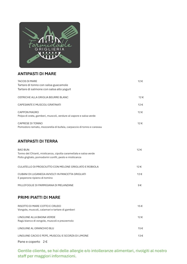 10/10Formidable Griglieria is a small treasure in the city of La Spezia. We discovered it by luck and it was the best choice we have made since we came in this city. The food was excellent, very tasteful for all of us as we tasted more than one dish per person and every choice was magical. The service was more than excellent! People there are very gentle, really helpful and extremely quick. The location is perfect and you can make a reservation online easily. I give bonus to the fact that it serves later in the evening than others in the city. I will visit it again for sure!