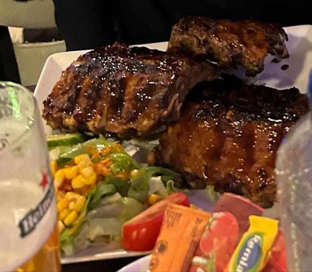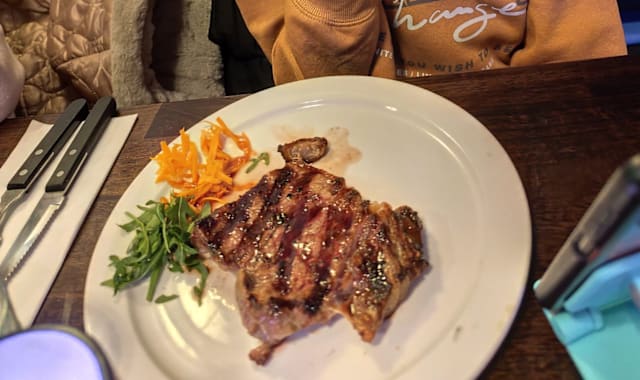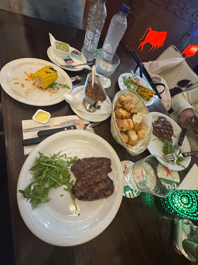 6/10Rib Eye was 7/10 for my taste but ambience was below average: dust and not clean surfaces was everywhere beside the tables. Toilets need restoration and the plasma TV was irrelevant.