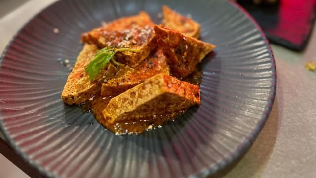 Fatias de tofu apimentado fritas e misturadas em um molho de pimenta perfumado.