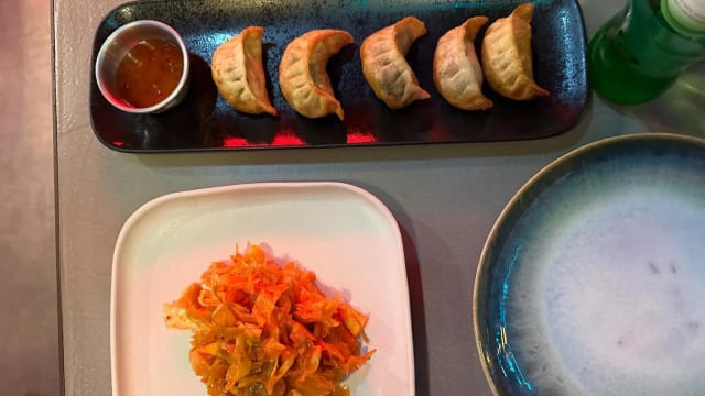 Gyozas fritos até dourar. Escolher entre recheios vegetais misturados ou carne de frango com milho e cenoura.