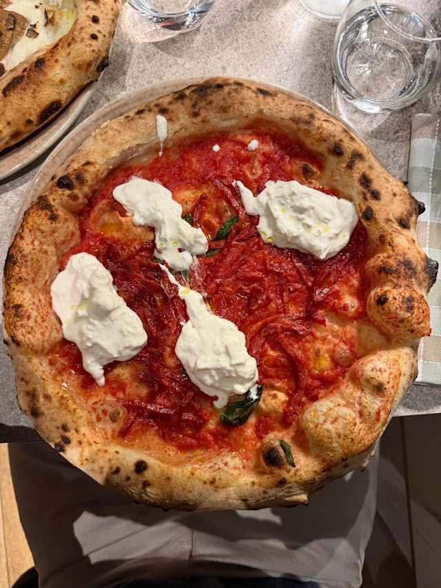 - Pomodoro san marzano, salamino piccante, stracciatella di bufala e basilico