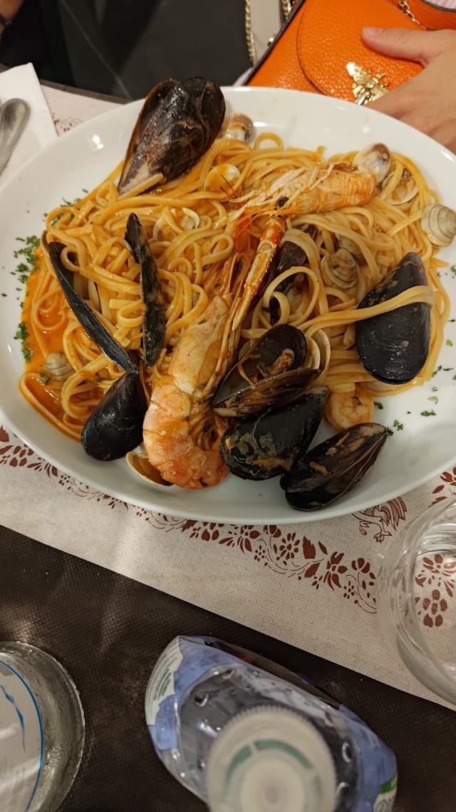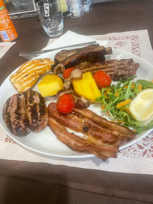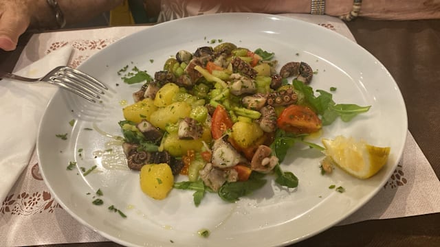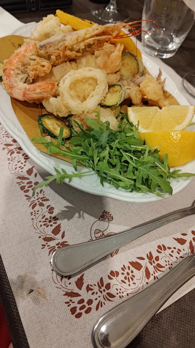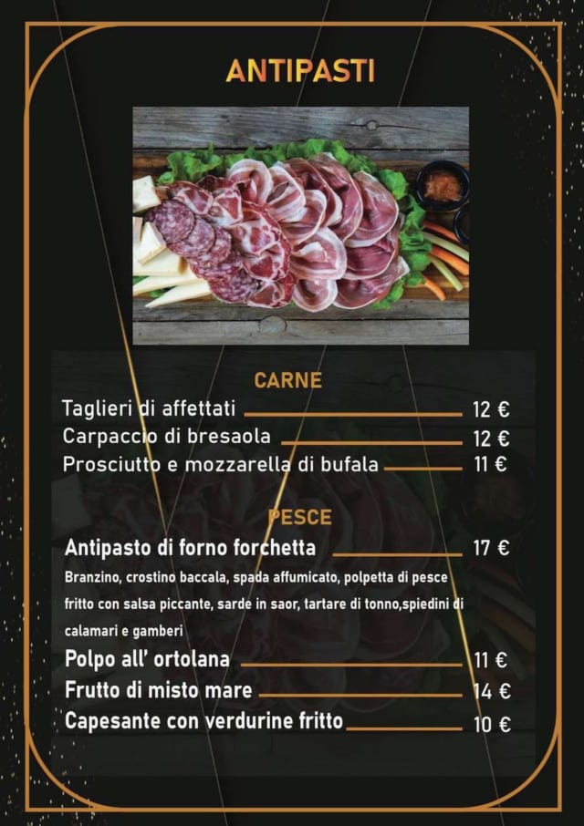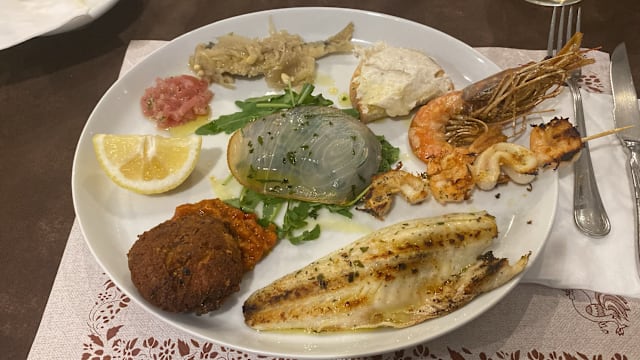 Branzino, crostino baccala, spada affumicato, polpetta di pesce fritto con salsa piccante, sarde in saor, tartare di tonno,spiedini di calamari e gamberi