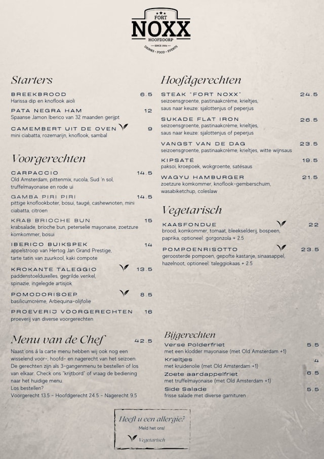 De Brasserie van Fort NOXX is een uniek restaurant voor jong en oud, gelegen in het gerenoveerde Fort van Hoofddorp uit 1904. Naast de Brasserie zijn er meerdere terrassen, een luxe wijnbar, evenementenlocatie, openluchttheater en vergaderruimtes. Kortom; De ideale locatie voor uw evenement of avond...