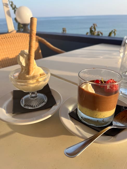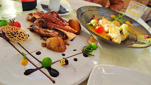 10/10beautiful sunset view with waves breaking over the rocks. excellent food and service. we were outside the building is beautiful inside as well. we had the fried prawns as a starter and I was expecting them to be breaded like they would be in the U.S. and was pleasantly surprised that they were not. I also got the chorizo rubbed cod and my husband got the seabass with pesto and both were delicious.