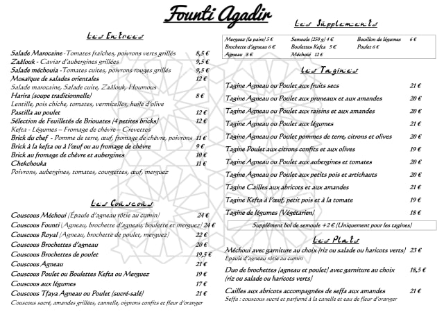 10/10My husband and I have been to Founti Agadir at least five times over the past ten years. We live in Laos and visit Paris almost every summer. There are no north African restaurants at home so we look forward to having cous cous or a tajine in Paris. We stay in the 5th arrondisement so Founti Agadir is a neighborhood restaurant - not only is it close but the food and service are excellent. This time we both had lamb tagine, mine was with artichoke and peas and my husband's was more traditional with potatoes, olives and lemon. With a side dish of cous cous this was a delicious and satisfying meal on an unseasonably cold evening. We recommend Founti Agadir as a very good address to have Moroccan cuisine, expertly prepared.