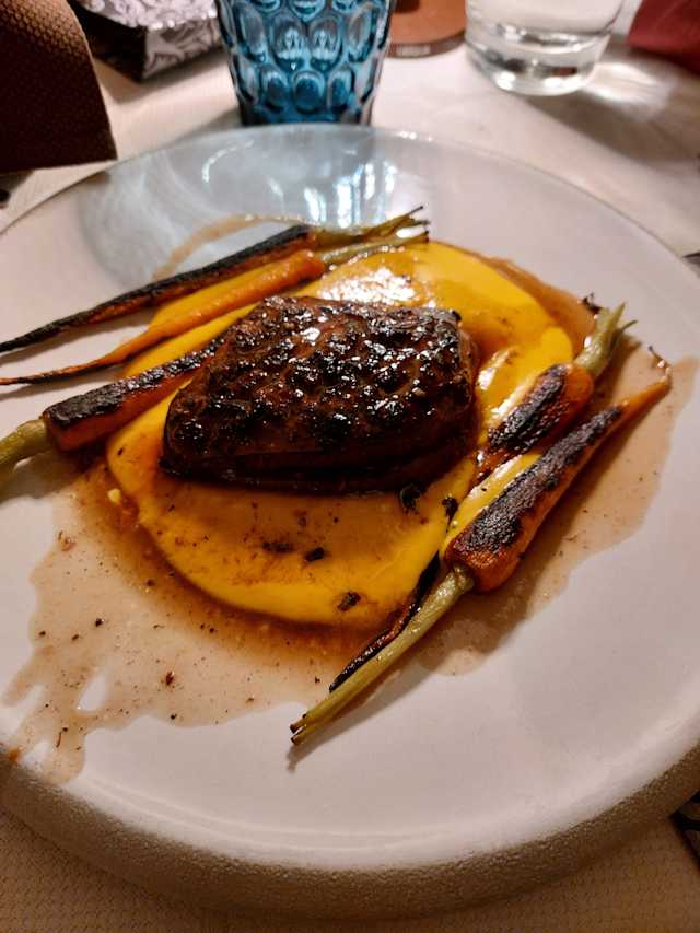 - Controfiletto di cervo, purea di pastinaca, ciliegie, carote baby