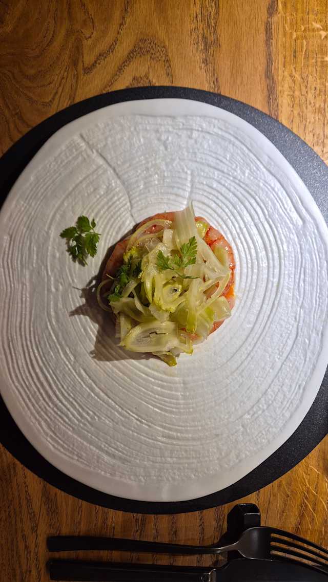 - Crudo di gambero rosso, pomodoro di mare e puntarelle alle acciughe