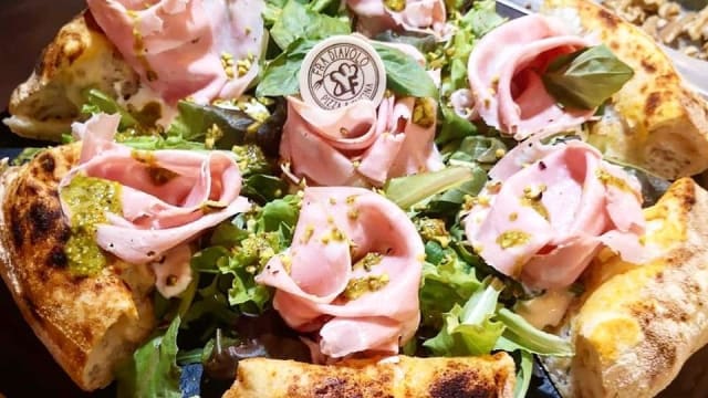 Fiordilatte dei monti lattari, mortadella bologna IGP raspini, stracciatella, pesto di pra’, granella di pistacchio, olio EVO