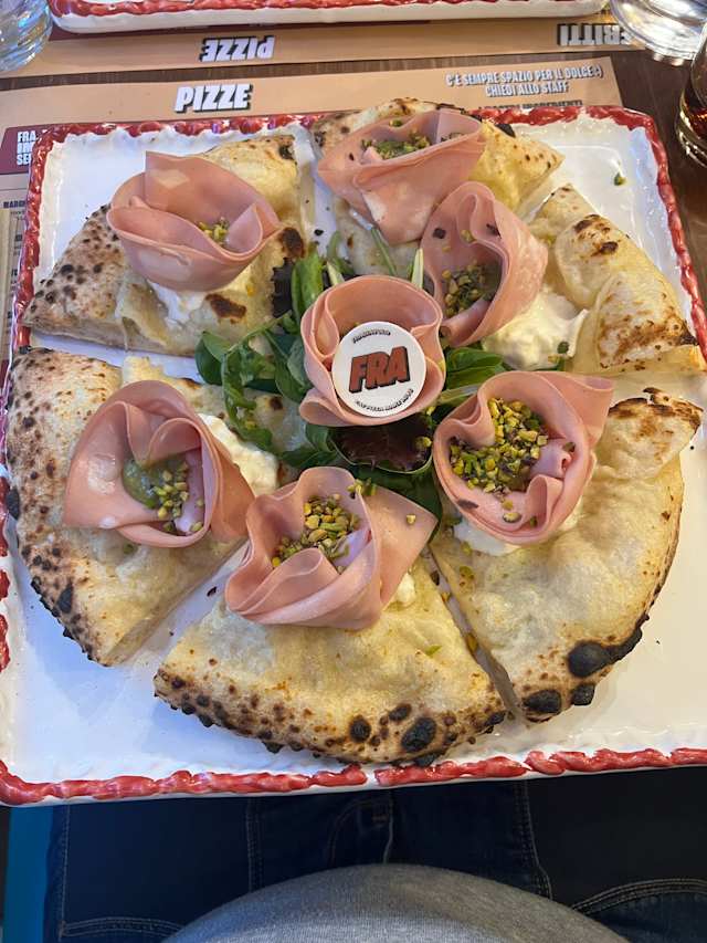 - Fiordilatte dei monti lattari, mortadella bologna IGP raspini, stracciatella, pesto di pra’, granella di pistacchio, olio EVO