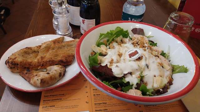 - Misticanza, pollo marinato in salsa di soia, scaglie di grana padano DOP, tarallo mandorlato, senape al miele e salsa yogurt