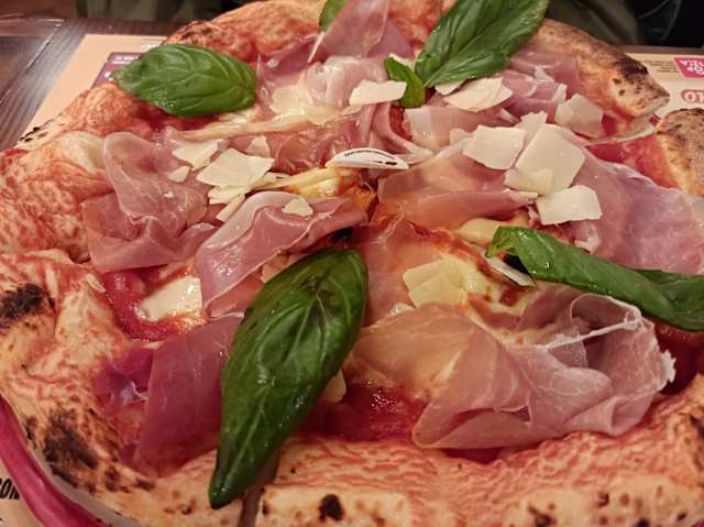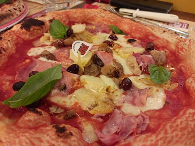 - Pomodoro la concettina, fiordilatte dei monti lattari, prosciutto cotto raspini, carciofi, funghi, olive, basilico, olio EVO