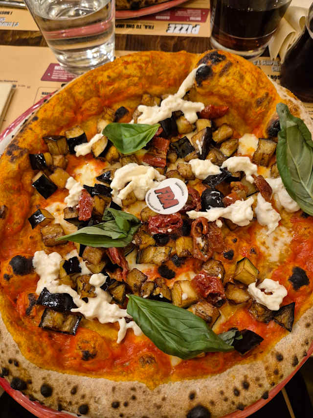 - Fiordilatte dei monti lattari, stracciatella affumicata, crema di peperoni al forno, melanzane fritte e pomodori secchi, basilico, olio EVO