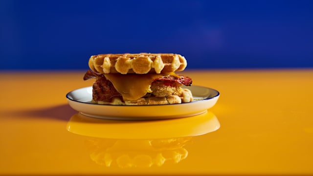 Waffle dourada, frango extra crocante, ketchup cítrico fran go!, bacon e queijo