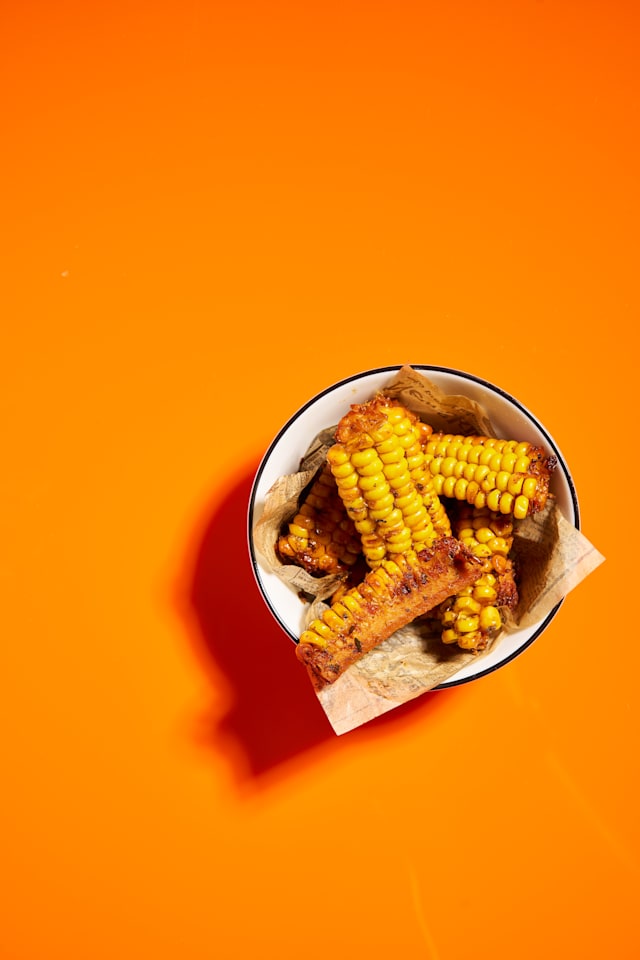 Espetada de frango glaceado com molho agridoce, fumado e tostado