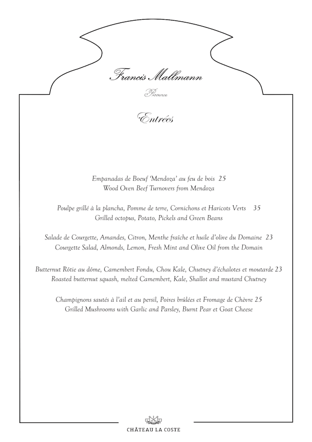 9.5/10+2My husband and I grabbbed a wonderful dinner at the restaurant after our wine tasting and tour at Chateau La Coste. The grilled calamari for an appetizer was delicious. I never order chicken at most restaurants but I knew the Bresse Chicken would be excellent. The tomato salad was very fresh, ripe, and sweet. The patagonia potatoes served under the chicken was beautiful but difficult to cut and eat therefore the server offered another option and they were amazing. My husband ate every bite of his line caught Croaker fish cooked on the plancha with roasted tomato sauce, Andina potato, and roast vegetables.