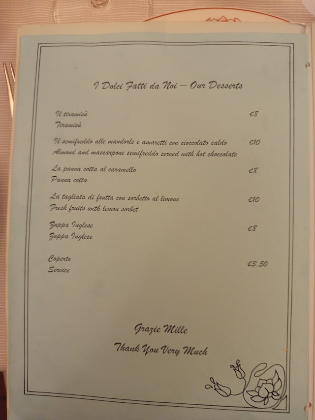 9/10Excellent food, whether primi or segundi, and divine desserts! Good and professional service. We were alone in the downstairs room, therefore very quiet.