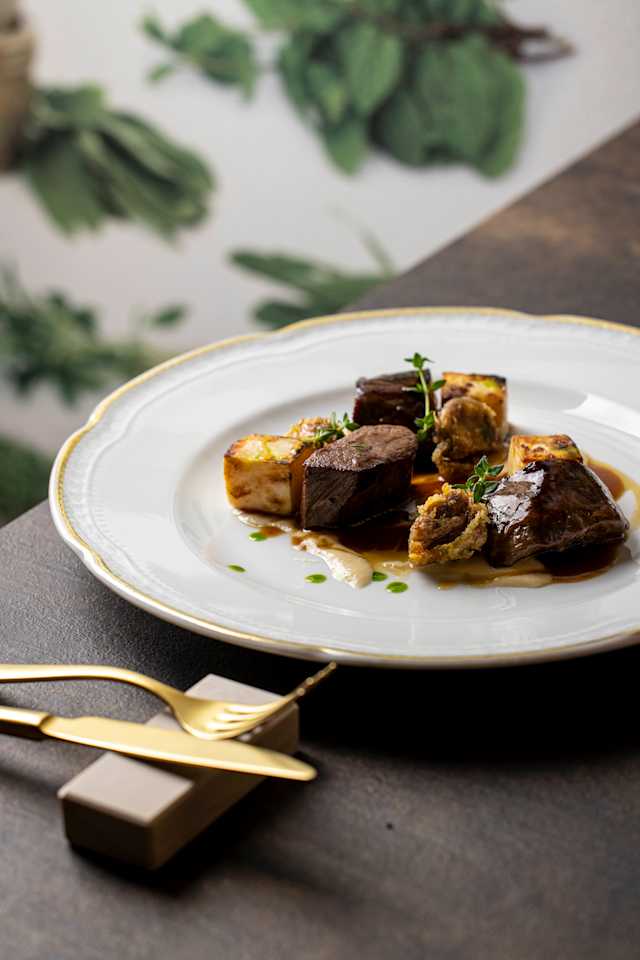 - Agnello affummicato, crema di sedano rapa, lampascioni fritti