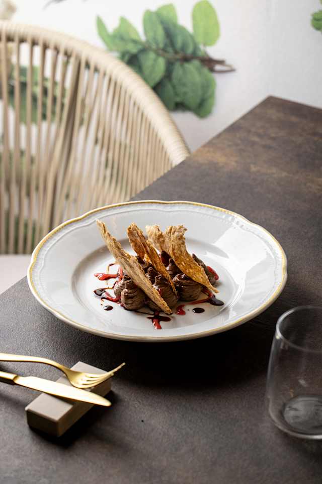 - Millefoglie di grano e noci, ganache di cioccolato fondente 70%, gel di melograno, vincotto