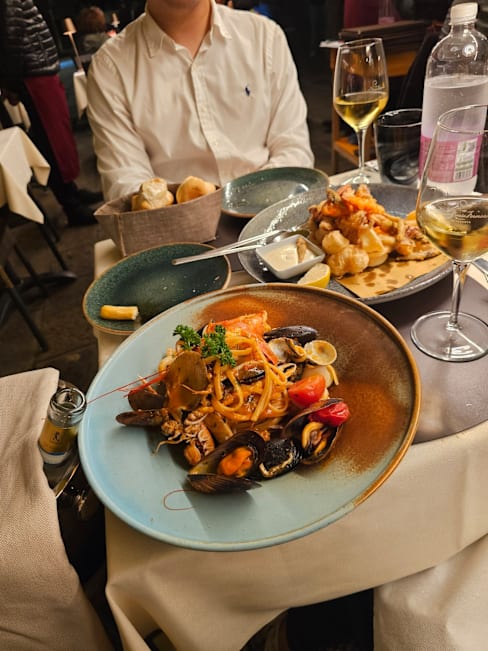 7.5/10Although the restaurant is located right on a train station, the atmosphere felt surprisingly intimate and not noisy at all. The tart wasn’t very good, but the pizza was quite nice. I ordered a pasta dish that wasn’t on the menu I saw it in a picture on the wall but it turned out to be nothing special.