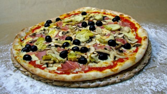 Tomate, mozzarella, jamén york, champifones, alcachofas y aceitunas