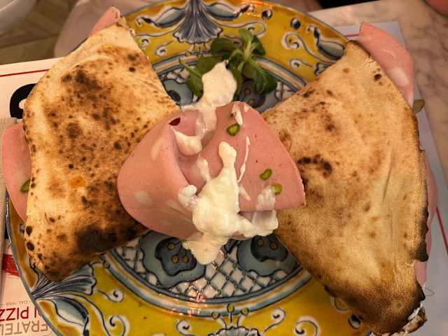 - Crema di datterino giallo, provola di agerola, panzerotto di patate, mortadella IGP, granella di pistacchi di bronte DOP, olio EVO