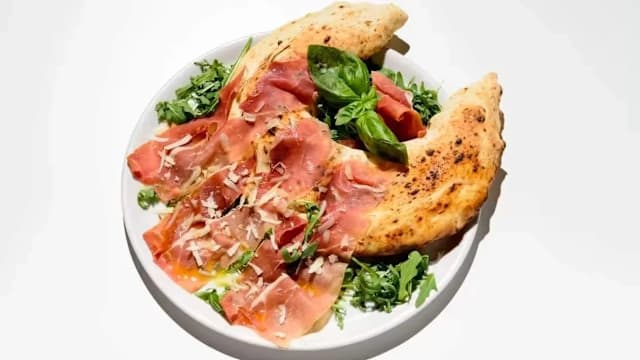 Calzone ripieno di emmenthal e mozzarella fiordilatte, servito con prosciutto crudo di parma stagionato DOP selezione la bufala, rucola, scaglie di grana padano stagionato DOP, basilico e olio evo