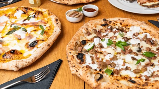 Pizza in due cotture prima fritta a bassa temperatura e poi cotta in forno ad alta temperatura servita con mozzarella di bufala DOP, pomodoro ramato all'insalata, basilico e olio evo in uscita
