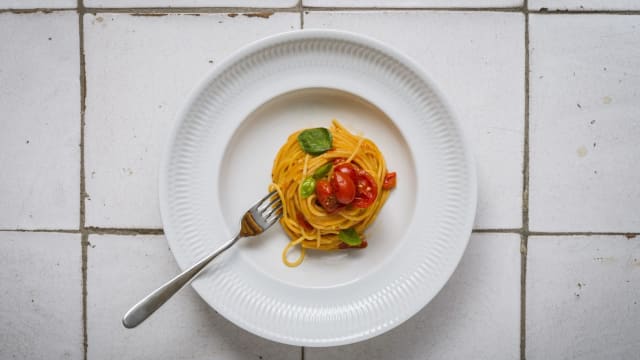 - Spaghettone servito con salsa di pomodoro, pomodorini gialli, pomodorini semidry e olio evo