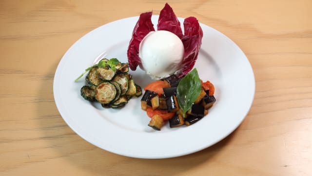 - Insalata mista croccante, pomodorini, mozzarella di bufala campana DOP, verdure grigliate alla julienne, basilico