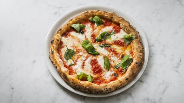 - Pizza in due cotture prima fritta a bassa temperatura e poi cotta in forno ad alta temperatura servita con mozzarella di bufala DOP, pomodoro ramato all'insalata, basilico e olio evo in uscita