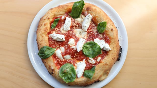 Margherita con cornicione ripieno di ricotta di bufala, basilico e olio EVO 100% italiano