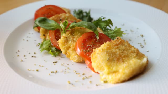 Mozzarella fiordilatte, melanzane indorate e fritte, pomodoro da coltivazioni del sud italia, grana padano stagionato DOP, basilico e olio EVO 100% italiano