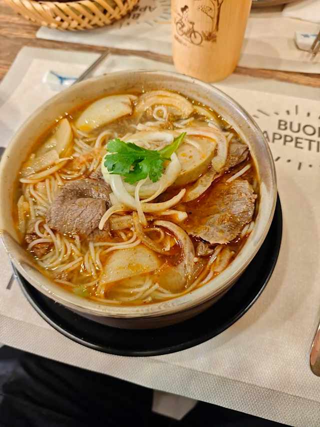 - Tagliatelline di riso e manzo in brodo di manzo con spezie vietnamite (cannella, anice stellato, zenzero, cardamomo, chiodi di garofano, semi di coriandolo, pepe)