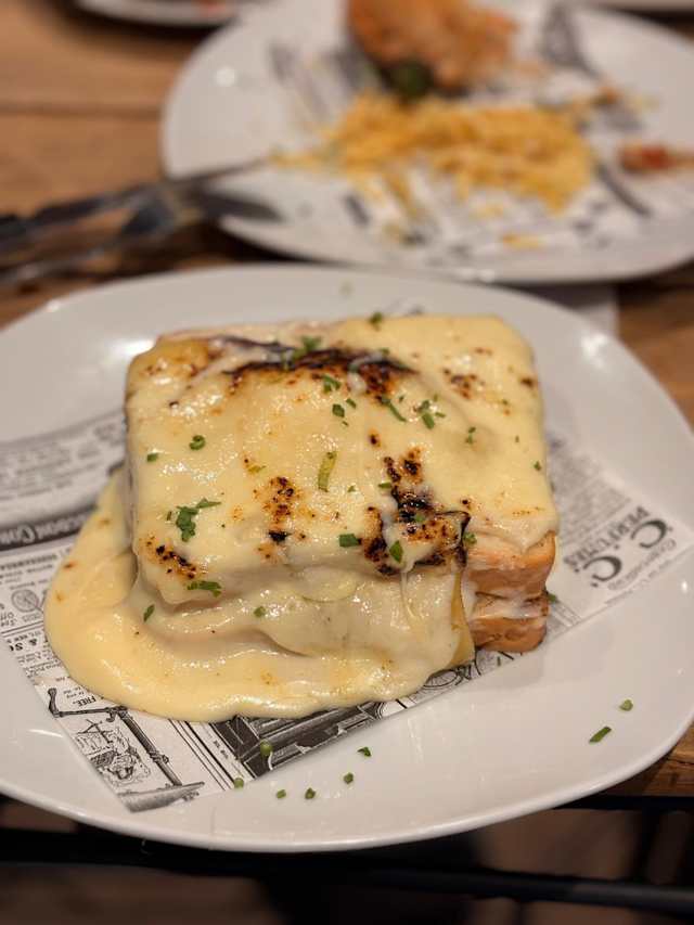 - Pan de molde gratinado con jamón, queso y bechamel.