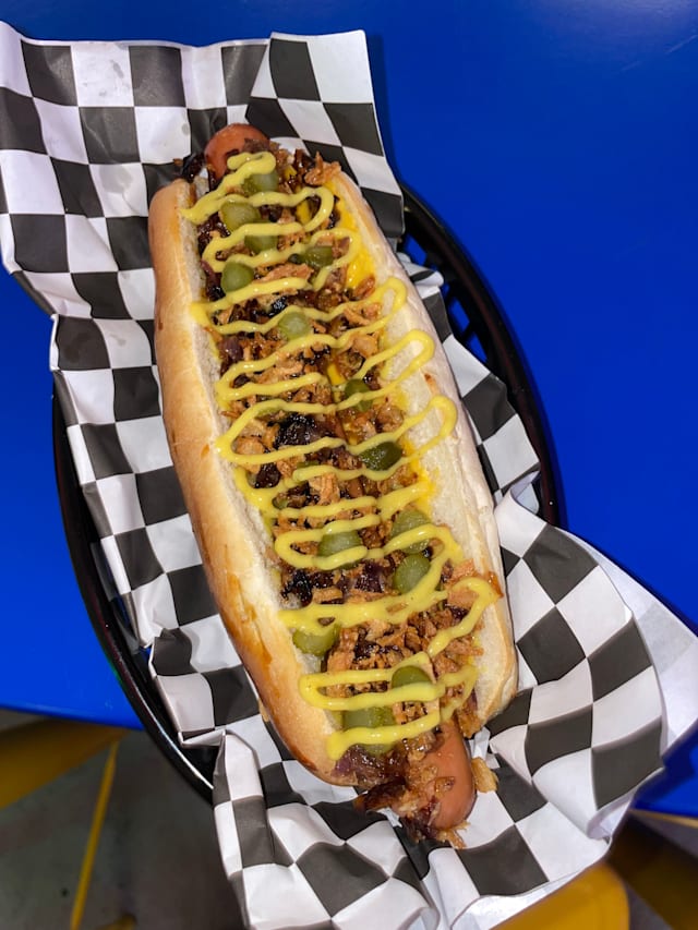 - Wurstel artigianale,cheddar, cipolla croccante, cetriolini, senape